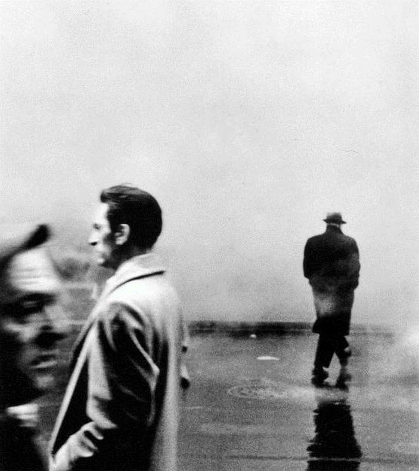 我们说大衣男子的形象在20世纪早期首次走进文化取景器。在第二次世界大战后,他仍然相当频繁地出现。鲁迪·伯克哈特(Rudy Burckhardt)在1947年时代广场黄昏的霓虹灯下盯住他。马克·吕布在1954年的英国发现他在疾行,看上去——用利兹方言来说——有些不合时宜。雷内·布里(René Burri)于1956年观察到他在匈牙利起义后穿过布拉格的鹅卵石小径。1961年,夏皮罗显示他正欲离开,走出画面[45]。他被模糊了,融入背景中。视觉传统的一部分是走出视线,为别人腾出地方,因为这种美学与即将来临的十年中所酝酿的不确定性和竞争更一致。照片前景是两个男人,其中一个简直就是特写镜头,从左边进入画面。那种老派的以欧洲为中心的贵气、文雅而忧伤,但自己拥有的确定性和慰藉——由侧影特写所表现——却又被某种不确定所取代。具有讽刺意义的是该美学也是欧洲影响的产物,尤其受到弗兰克的影响。夏皮罗作品中的这一人物形象有一种强烈的离别感——他自己就标志着哀伤和怀旧——准备好离世和消失。而柯特兹的替身在舞台右侧退场,身后拖曳着雨的映象。此后,他的出现就如白驹过隙(再一次停下观察破损的长凳),痛惜自己的消失。在20世纪60年代中期,柯特兹的复兴急速进行着。其时将这一人物形象象征性地等同于即将逝去的摄影师是合适的。他走出摄影史,对其历史地位的确定充满信心。