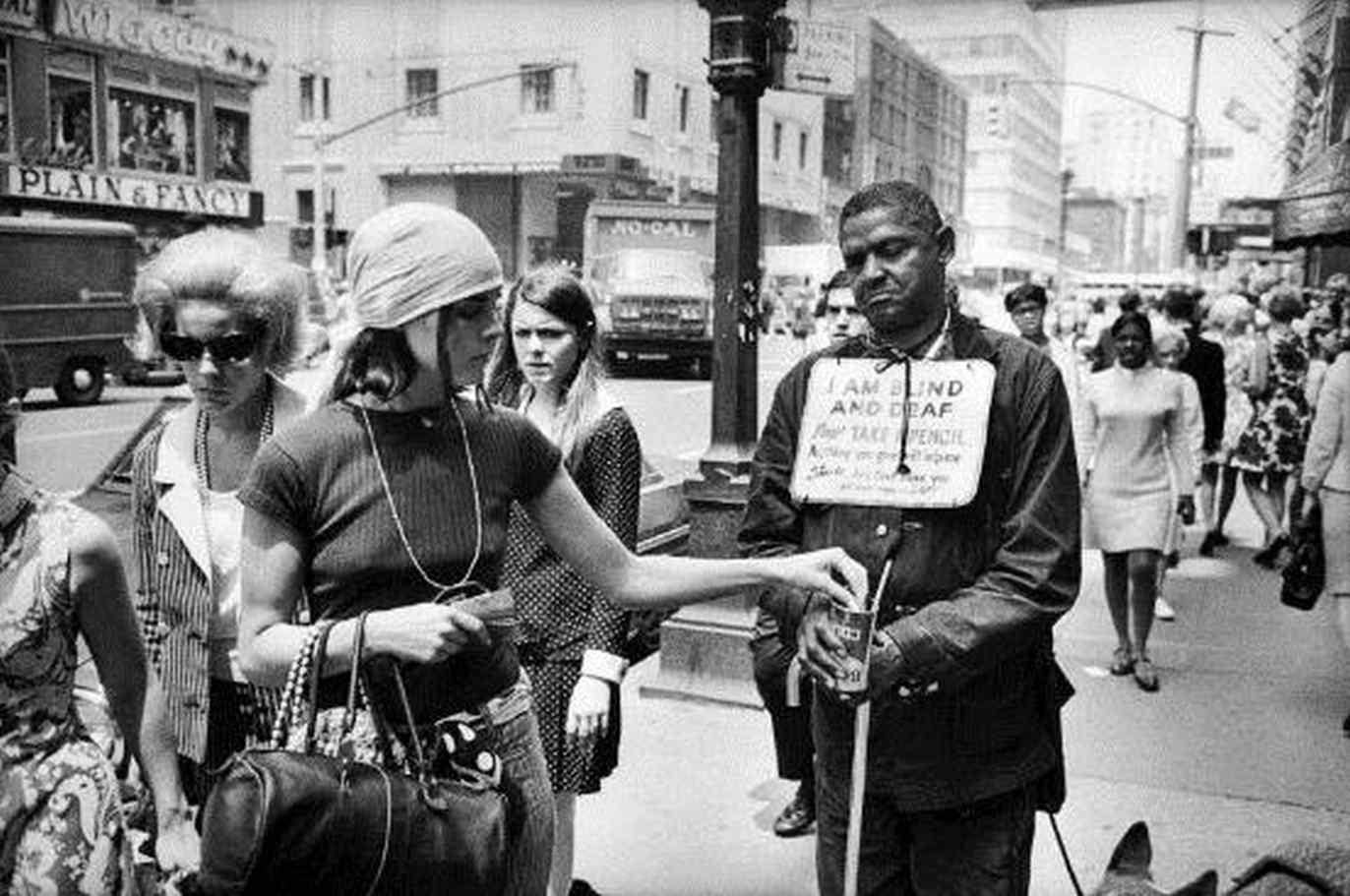斯特兰德希望大家清楚那位盲妇并不是一个乞讨者,而是一个做小生意的人。温诺格兰德拍摄的那位盲人好像也在设法进行某种商业交易:他向那些“无论你送什么都将帮我大忙”的人回赠铅笔。那块牌子还告诉我们,他的“狗的名字叫女士”(就是出现在底部边框处的两只三角形的耳朵)。这是典型的温诺格兰德式街景:繁忙热闹,人流涌动,却反衬出(如海因的作品)盲人的过度静止。看上去他好像至少从20世纪30年代开始就站在那儿了。这是如此的惊人,不仅是他的衣服还有他的头发质地,他的一切都表明了他来自不同的时代;一个来自30年代农业安全管理局摄影计划时代或是海因和斯特兰德时代的流浪汉。他看起来好像是从以前的照片中被剪贴至此的人。20世纪60年代后期妇女解放运动风起云涌,显然鼓励了那位女士将硬币丢进盲人杯中之类的行为。温诺格兰德通常会捕捉这种互动时刻,同时也是疏远和分离时刻。她与他保持着一臂的距离。这是众多可能进行的交易中的一个,而这张照片的拍摄碰巧也是其中的一个。