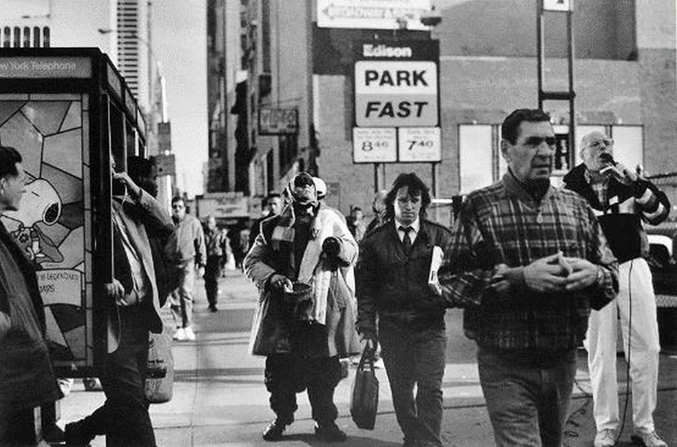 迪柯西亚拍摄的街景让他在20世纪90年代中期获得了一些意外的发现和机会——不是为了削弱他对街拍的持久迷恋,简直就是在阐明它。和之前的很多街头摄影师一样,他选择了在较为合适的地方等待人们经过,等到那一刻,不仅是简单快速按下快门,同时也激活精心准备的、预先调适的闪光灯。1993年,迪柯西亚在纽约以此方式精心设计了一幅典型的温诺格兰德式的繁忙街景,左手边一个男人斜倚着公用电话亭;右手边一个秃顶的男人正对着话筒说话。在整张照片的中间,一个体形笨重的盲人乞讨者,裹着厚外套和围巾[4]。整个场景都光线明亮,路人在其生活中暂时停留,那位盲人则因处于一个辐射照度的意外光环中被人所铭记。在温诺格兰德的照片中,那位盲人看上去好像就是从他早期图像中剪下来的。而迪柯西亚那光线的洪流则看起来好像是用数码技术缝制到场景里,就好像世界因拍摄照片的行为而重置。
