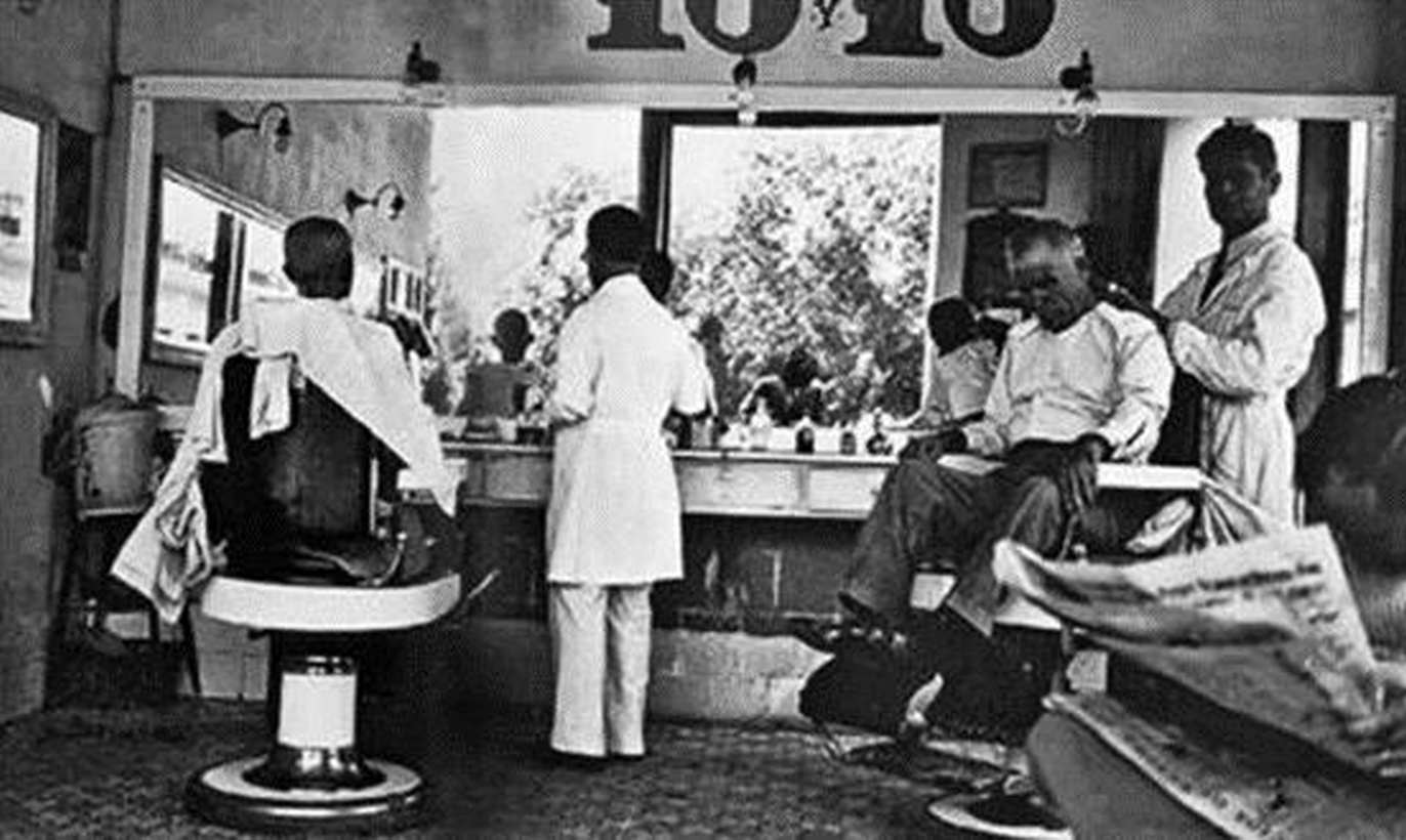 理发店差不多就是一个小世界。威廉·克莱恩(William Klein)在1956年的罗马拍摄“团团转的理发师”,在意图和目标上与埃文斯1933年在哈瓦那拍摄的相似[67]。理发店是一个你可以理发的场所。这是该机构的定义属性,但一些其他因素也是必不可少的:对话的有效性(如果需要),休闲阅读的材料和承担特定任务的椅子(在为等候中的顾客提供的普通椅和牙医可怕的专用椅之间)。你可以在任何地方理发但并非处处都是理发馆。1938年,拉塞尔·李在密苏里州的卡罗瑟斯维尔附近拍摄了《农夫为兄弟理发》。很少有照片像这张表现乡村生活的照片使人联想到生存和乡村生活的恢复。他们坐在门廊上,在弟弟或儿子的注视下,此情此景,理发似乎是一种奢侈,简直是度假。