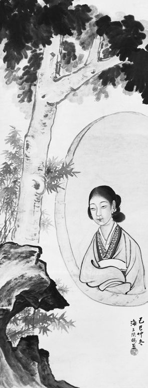 陆丹林有一天,过张大千的大风堂,大千恰巧作着白描仕女画。丹林见了,大诧,因所绘的面貌,酷肖他的女友心丹,阿堵传神,不啻为伊写照。大千知道了,便把这画慨然赠给他,丹林付诸装池,张挂在他的红树室中,朝夕晤对着。潘兰史题七绝一首云:“妙笔张髯偶写真,惊鸿画里见全身。却疑帐里姗姗步,好托微波赋洛神。”后来丹林三十七岁初度,杭州诸季迟赠给丹林一首诗,末两句也提及这画:“还从张髯补天手,返生香里写双身。”
