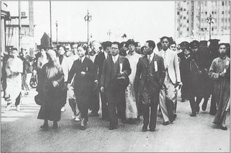 救国会领导人沈钧儒(前排左1)、史良(前排左2)等在上海领导群众反日游行