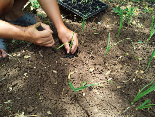老李帮忙挖好土移栽大蒜苗。