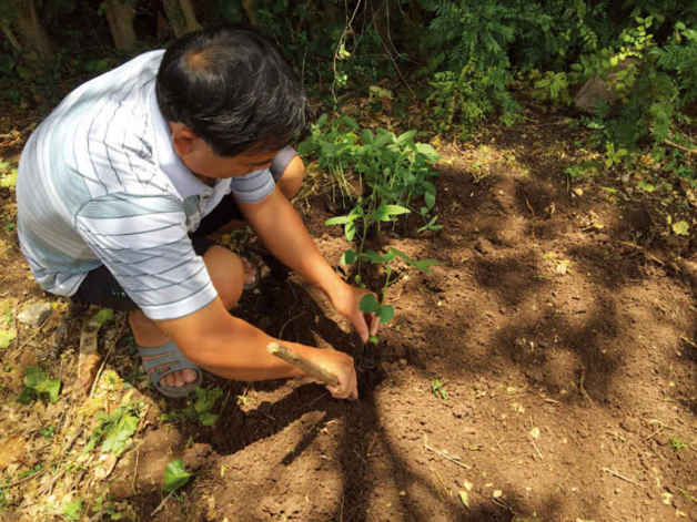 老李还是闲不住,我洗完碗,他进来说土挖好了,在院子一角咖喱树下。黑色的土,翻出来的蚯蚓正努力扭直,四周修了沟,树下放了挡板。老李弯腰手指着,这里一排,那里一排,种好了,别说你自己吃,拿出去卖都有剩。