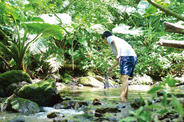 有上司在的时候,谢总跟我一样,只在有事情时出来,平常待在房间,我们私下没有更多交集。但是在一起吃过不少次饭,我知道他平常爱到山里找灵芝,海边找阴沉木,是个喜欢玩的人。所以等他上司一走,我问他去不去山里抓虾,这个事情我想了一年多,只是苦于没伴,又不知地方。谢总一听,说成啊,第二天早上十点钟准时到了我住处。正值夏天,植被疯长,推开门,前厅地板倒映着绿的木瓜树和辣椒树,篱笆外的凤凰木有的花还没谢,有的已长出细细密密的新叶,雪白的阳光下大红大绿衬着,看得人心情十分明朗,仿佛回到童年大人不在家的暑假。一个桶,一只捞网,简单两样工具放在皮卡后面,我们出发了。