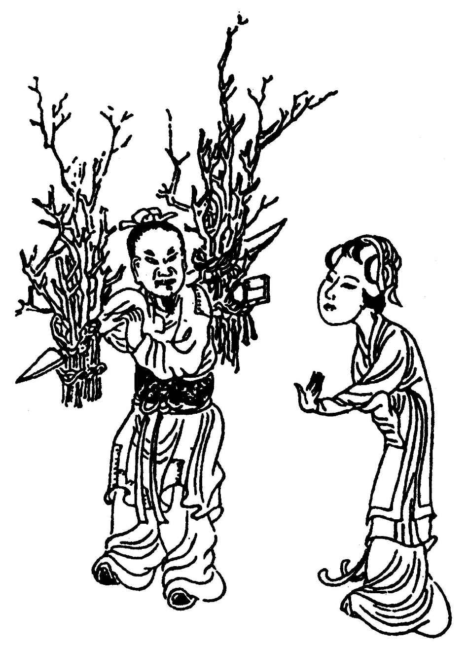 朱买臣之妻主动提出与丈夫离异,是因为丈夫“贫贱”,而非因其“不贤”。(选自《博古叶子》,明陈洪绶画,黄建中刻,清顺治十年刊本。)