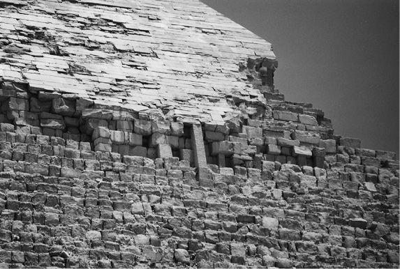 这是海夫拉金字塔的一个细节部分。阿拉伯人放弃了在此拆除盖面石料的工作。修建这座金字塔及其它金字塔所涉及到的惊人精确性被展露无遗。