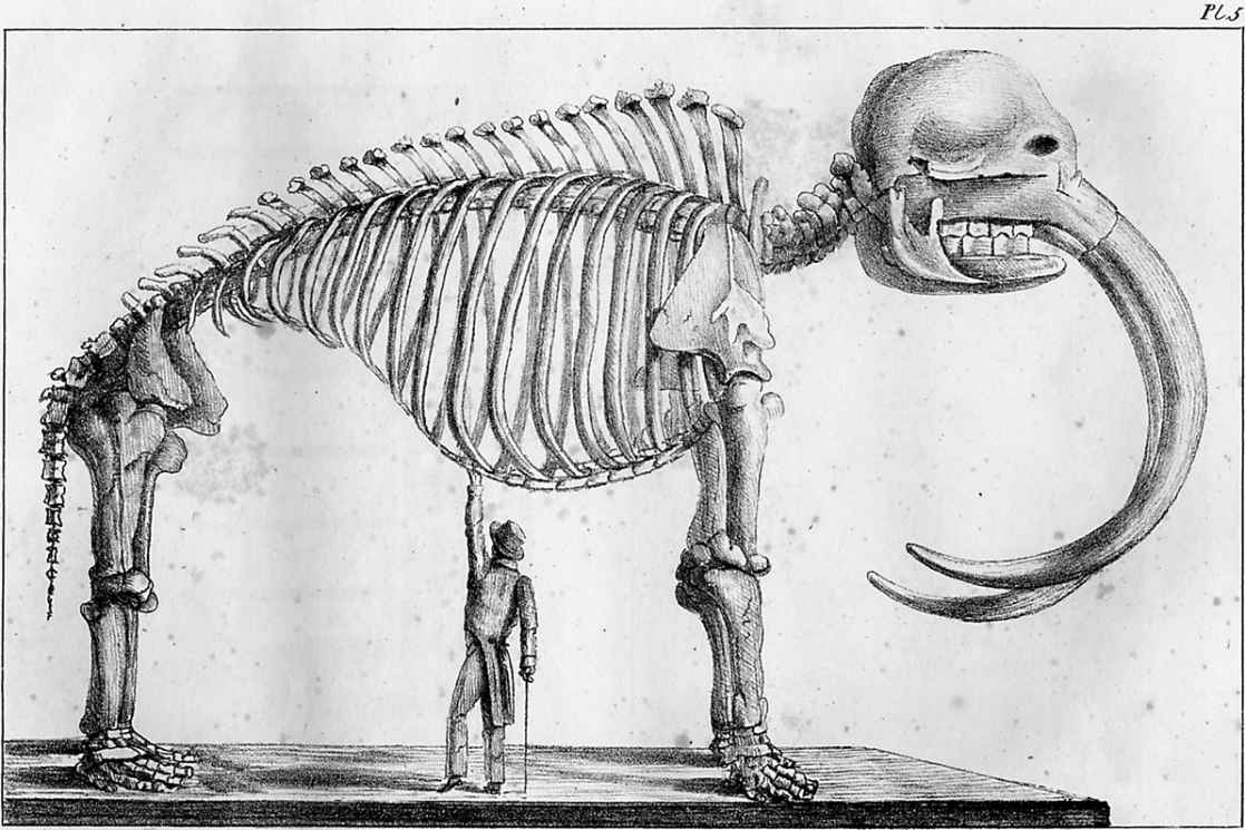 尽管英国与法国之间正在打仗,居维叶还是设法搞到了一些绘图,详细描摹了皮尔的儿子们带到伦敦去的那副骨架。这些图让居维叶对于这种动物的解剖学特征有了更深的了解。他意识到,乳齿象与当今大象的区别远大于猛犸与大象的区别。因此,居维叶将乳齿象分类到了一个新的属中。(在今天的分类学中,乳齿象不但有自己的属,还有一个自己的科。)除了美洲乳齿象之外,居维叶还鉴定出了其他四个品种的乳齿象,“就今天的标准而言,它们都一样奇怪”。直到1809年,皮尔才听说了居维叶给这种动物起的新名字,并立即将其据为己有。他写信给杰斐逊,提议在他费城的博物馆为乳齿象骨架搞一个隆重的“命名仪式”。[25]杰斐逊对于居维叶想出的这个名字却是不冷不热,轻蔑地表示,这个名字“大概也不会比其他的名字好到哪去”。[26]所以,他也没有对“命名仪式”的提议给予回应。