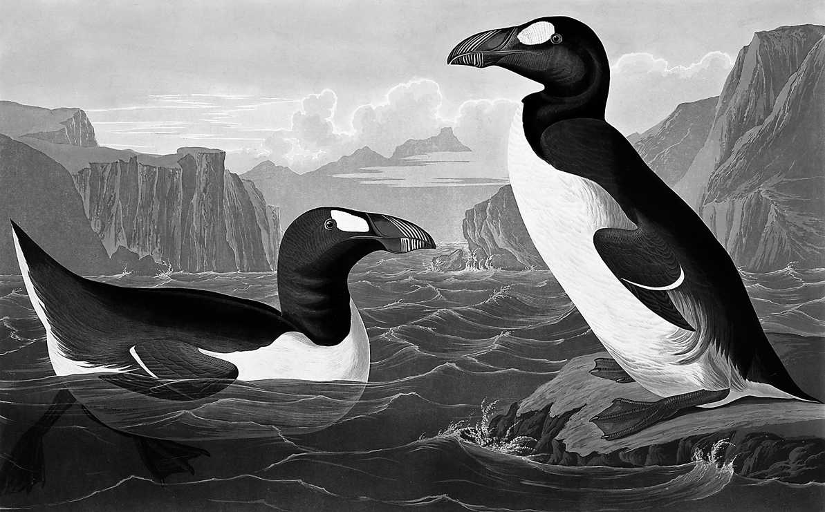 这些团队是否真的把岛上最后的大海雀都赶尽杀绝了?或者这些屠夫只是把种群数量降低到了一个岌岌可危的程度,使其很容易受到其他力量的影响?(减少种群的个体密度可能会让剩下的个体变得不易存活,这个现象称为“阿利效应”[Allee effect]。)对此我们尚没有答案。无论是上述哪种情况,大海雀从北美地区消失的时间一般被定为1800年。大约30年后,约翰·詹姆斯·奥杜邦(John James Audubon)在绘制《北美鸟类》的时候专程来到纽芬兰寻找大海雀,期望能描绘它们在野外的生活状态。然而他一只大海雀也没有找到。为了完成绘制工作,他不得不使用了一只来自冰岛的大海雀填充标本,由一位伦敦的商人提供。在对大海雀的描述中,奥杜邦写道:它们“在纽芬兰沿岸地区很稀有,偶尔才能碰上”,以及它们“据说是在该岛的岩块上繁育后代”。[36]这段描述自相矛盾,因为没有一种繁育中的鸟类会是“偶尔才能碰上”的。