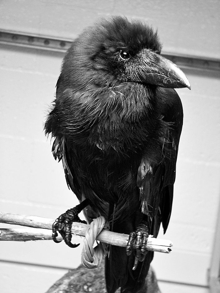 来到奇诺希的笼子前,我发现那其实更像是套房,一间前厅大得足以让几个人一起站进去,一间里屋满是绳子和其他的乌鸦娱乐设施。奇诺希蹦过来跟我们打招呼。他从头到爪都是乌黑的颜色。在我看来,他跟美国常见的普通短嘴鸦非常相像,但达兰特向我指出,奇诺希有着更厚的喙和更粗的腿。他的头向前低着,就像是在避免与我们的眼神接触。我心中好奇,当他看到达兰特的时候,是不是会有某种鸟类式的下流想法?达兰特把带来的小吃给了奇诺希。他回应了一声沙哑的呱呱叫声,听着有种诡异的熟悉感。乌鸦是能够模仿人类说话声的。达兰特说奇诺希刚才的叫声意思是说:“我知道。”