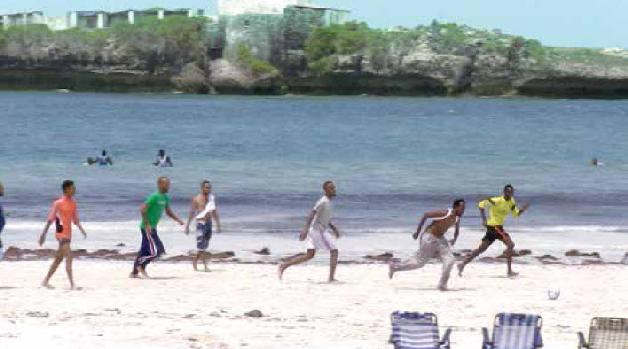 安保队员们换掉了自己严肃的一面。他们有的放下枪脱掉上衣,跳进了海里,向远处游去;有的奔向了远处在沙滩上光脚踢球的人群,背着枪加入了他们,一起奔跑着,追逐一个破旧不堪的足球。