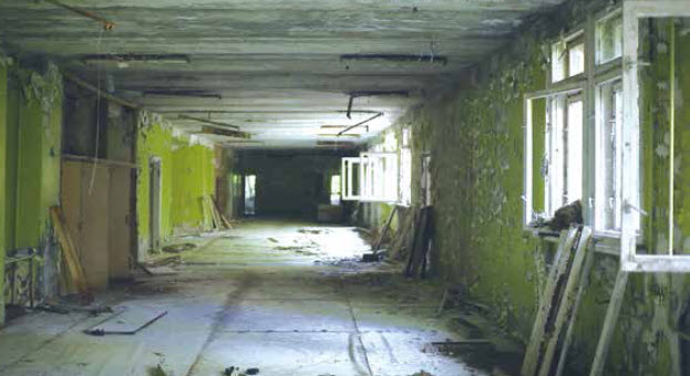 那是一所学校,在10公里辐射圈边缘处。向导说,这是当时救援人员们集结、休整的地方,还有普里皮亚季来不及转移的人,也临时安置在这里。