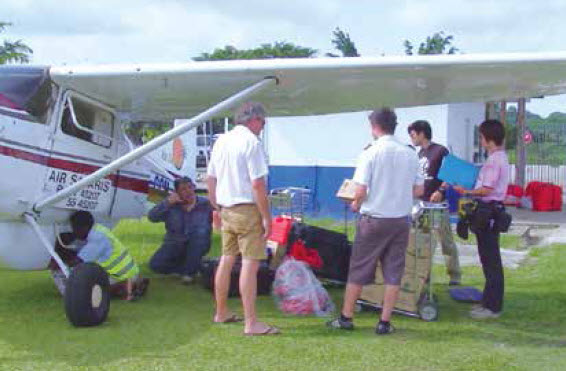 我们运行李的车只能停在机场门口,物资加原来的装备,将近一吨重。机场保安不管,让我们自己搬上飞机。搬了一个回合就不行了,这得到猴年马月!于是给租我们飞机那老板打电话,对方很爽快,说马上过来处理。几分钟后,他开着辆摩托飞奔而来,打了一个“OK”的手势,这事儿他来办。