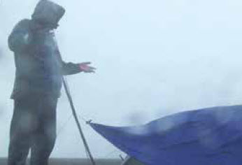 接下来,台风的王牌军来袭。这次的打击是灾难性的,雨几乎就是横着飞,子弹一样射在身上;装备箱被吹得往高处滚,损失了几件装备;剩下为数不多的帐篷杆儿也全折断了,只能用仪器设备的脚架顶着。