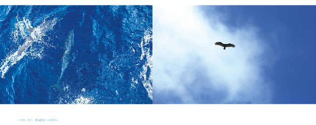 两条海豚跟在“北京”号后面,像在跟我们玩儿似的,一会儿追逐,一会儿超过我们,在前面领航。在太阳和水的折射下,海豚的颜色一直在变。围着船舷,看着欢快的海豚,大伙儿刚才的紧张,一下子被卸掉不少。