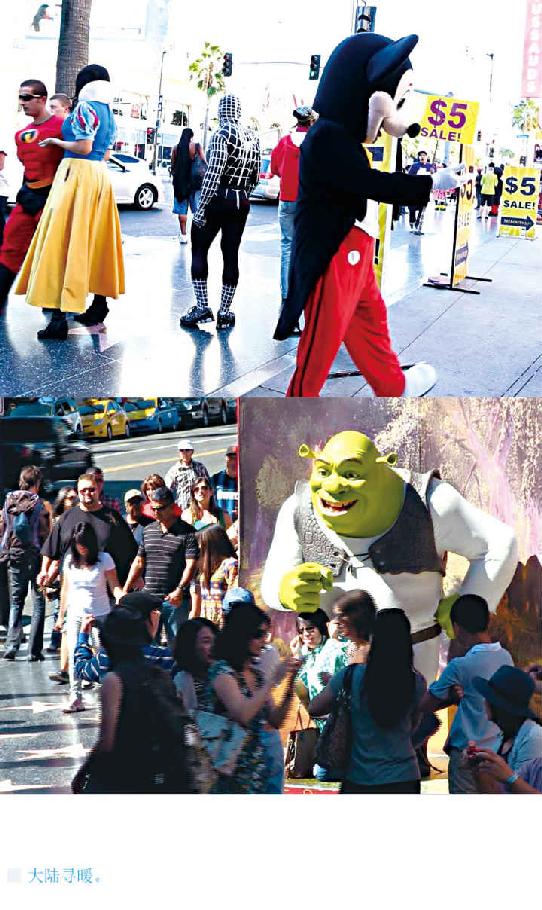 边走边拍照的游客、叫卖的商贩、卖唱的披头士……更吸引人眼球的,是那些穿梭在行人之中的cosplay明星。杰克船长、超人、蜘蛛侠、米奇和米妮,变形金刚,等等。他们靠跟游客合影挣钱。