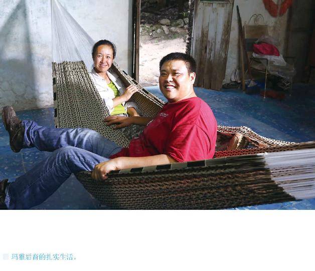 梁红对玛雅人的吊床很感兴趣,问哪儿可以买到。哈奇德推出他的车——一种特有意思的交通工具,类似于北京的三蹦子,但是车厢在前面,司机在后面蹬,推着人走。哈奇德让我们上车,他载着我们来到哈奇德叔叔的家里,他是这个村里唯一会做吊床的人。一进家门,梁红就被屋子中央的一个吊床吸引住了,花花绿绿特别喜庆,而且很大,两个人躺都绰绰有余。我俩上去试了试,居然绷得住,质量不是一般地好。