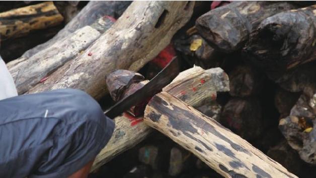 我说想看看木材的成色,他们拿了把锯子来,在尾部开始锯,只锯出浅浅的一道痕,锯片儿就卡住了,根本锯不动。换了砍刀来砍,跟敲在铁锭上似的,“叮叮”作响。好不容易凿断一截,再看那砍刀,俨然成了锯子。我闻了闻刚截断的红木切面,辛辣味儿。