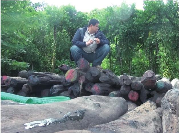 迈尔斯给我介绍了一下红木砍伐的工序:伐木工人们在深山里找到红木,砍倒,去枝桠,然后在尾部凿一条沟槽,用绳子拴牢,再几人合力往木场拖。一般人不可能单独搬运起一棵红木。