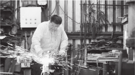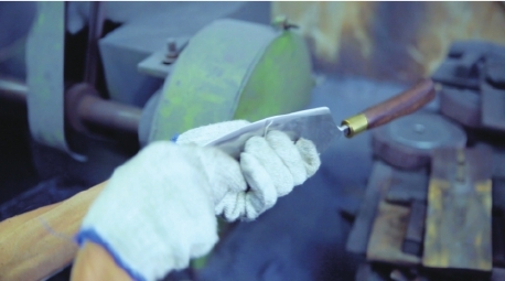 用切割机时,看到我的手竟然异常平稳,一旁的吴老啧啧赞叹,我开始有点儿自鸣得意了。但在锻打刀具的过程中,我还是出糗了,不管怎么敲,刀把就是越来越歪;一旁的吴老指点道,锤子要往刀口的位置打。