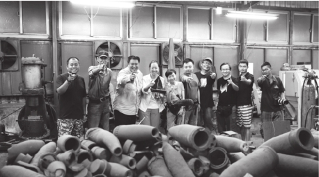 我对手工制作天然着迷,很想拜师学艺。吴老很爽快地答应了,还亲自示范一遍所有工序给我看。从气割炮弹、锻打菜刀,到切割菜刀毛坯,裁剪成型,最后进行淬火、砂光打磨等处理工艺,不到20分钟,一颗弹头上切下来的弹皮,摇身一变成了一把锃亮锋利的刀。吴老拿着刀轻松地将报纸划成条状,仿佛武侠小说里的吹发即断。我和梁红惊叹不已,竖起了大拇指。