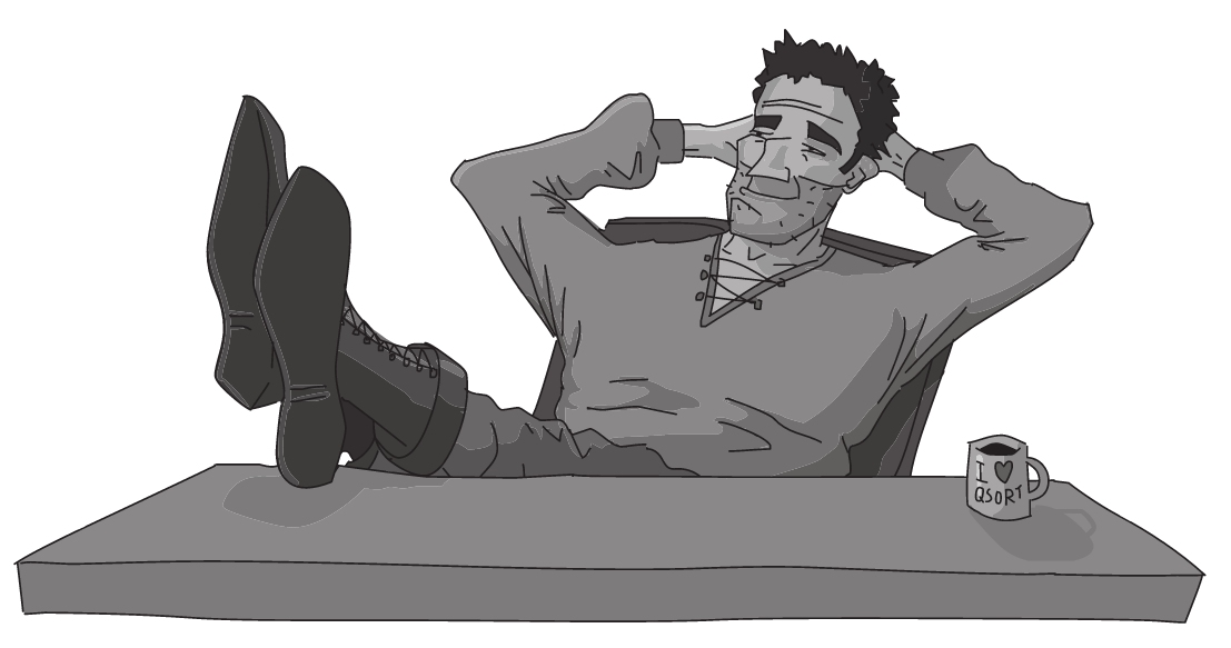 没听见敲门声,门竟然开了——只有大门铰链的嘎吱嘎吱声宣告了有人到访。Frank立马起身欲取来十字弓,却又骤然停住,他想若是Vinettee集团的人登门造访,一定会敲门——不过是用斧头。进门者无论是谁,想必都有话要说。于是,Frank伸手拿起马克杯,将杯底仅剩的那点冷掉的咖啡一饮而尽。