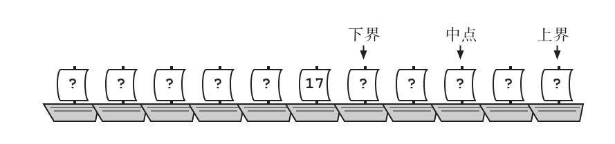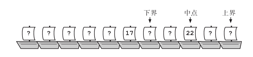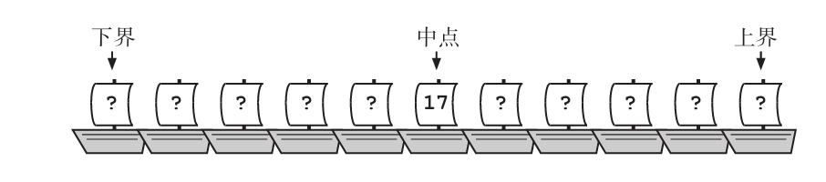 二分搜索算法用于高效地在有序数组A中查找一个目标值v。和线性搜索不同,二分搜索利用数据结构中的信息让搜索更高效。高效算法的关键是信息。在下面的例子中,我们就要使用数组是按照升序排序的这个信息: