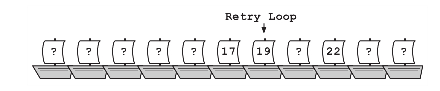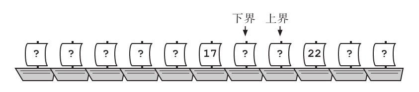 “我们的目标值是19,我们的算法是二分搜索。现在搜索空间是整列船只,所以我们已经有了上界和下界,如果我们使用闭合区间,那么我们的下界是第一艘船,上界是最后一艘船。如果Retry Loop在这里,很明显它不会在第一艘船之前,也不会在最后一艘船之后。