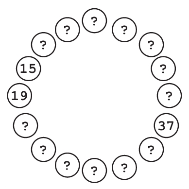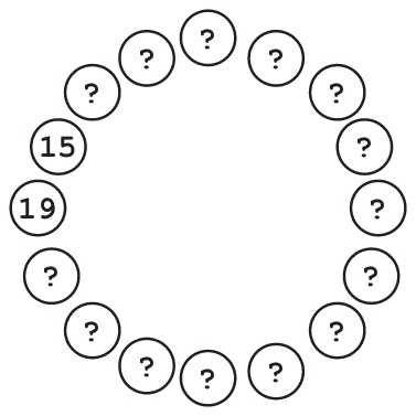 有了这个信息,Frank几乎可以确定这群人是按资历由浅到深沿着逆时针方向排列的了。但他并不能完全确定,因为或许“15天”和“19天”便是这群人中资历最浅和最深的人了,虽然这种情况的可能性很小。Frank曾经有过草草率率便开始搜索的经历,结果可想而知,并不理想。因此在他真正开始搜索之前,他需要再找一个数据点。他选了剩下的恶棍中正中间的那位。