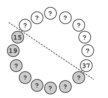 有了这个信息,Frank得以证实了他之前的猜想——这群恶棍的确是按资历由浅至深按逆时针顺序排列的。因此,Frank可以不再考虑“15天”和“37天”之间的任何人了。资历最深的恶棍如果不是“37天”的话,就一定在“37天”的逆时针方向,且在“15天”之前。