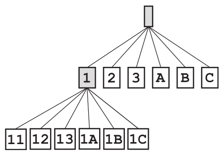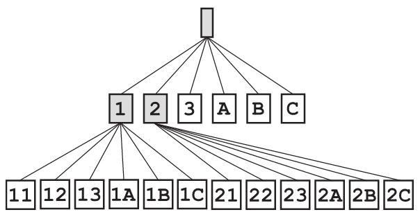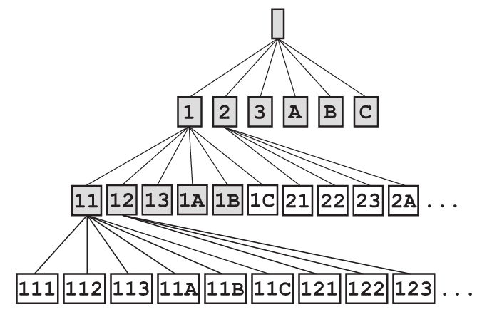 再一次,搜索树的最后一层延伸出了新的可能性。但搜索算法本身依然停留在第二层继续尝试,在尝试完所有一位的密码后才会进入到搜索树的下一层。