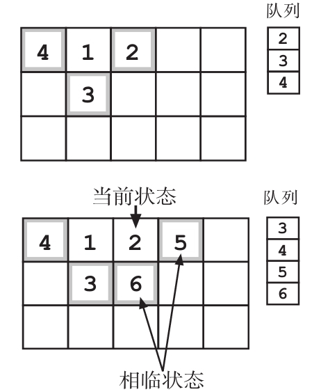 “对,”Frank说道,“你之前用过的魔法列表就是一个队列。在广度优先搜索中,这个队列是用来记录还没有探索过的选择。不过每次是将和当前状态相邻的状态加到队列的尾部,而不是将当前状态推入栈中。”