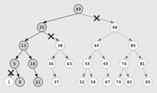如果想找在区间[8,20]内的所有值,你只需要访问全部25个节点中的7个(被访问的节点被标上了阴影):