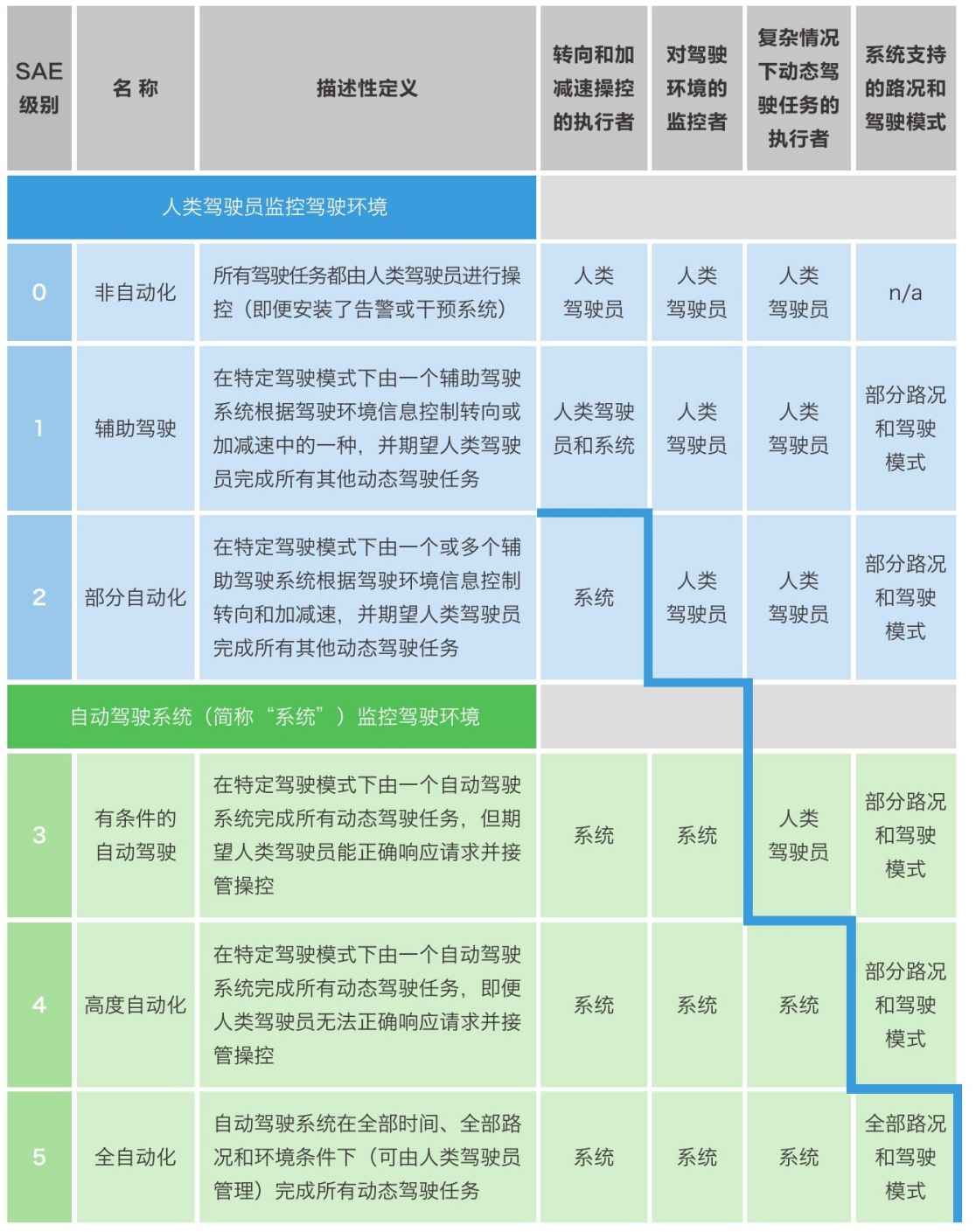 SAE标准将自动驾驶技术分为0级、1级、2级、3级、4级、5级,共六个级别。具体的级别划分和描述如下页图表99所示: