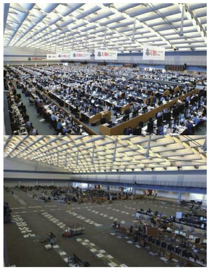 2016年9月5日,嘉信理财集团(Charles Schwab)的首席投资战略师丽兹·安·桑德斯(Liz Ann Sonders)在她的个人推特页面上贴出了两张对比鲜明的图片。那是瑞士银行设在美国康涅狄格州的交易场,整个交易场的面积比一个足球场还大,净空高度超过12米,交易场内曾经布满了一排排的桌椅和超过一万名的资产交易员,是世界上最大的金融资产交易场所。可是,2016年人们在这里看到的却是一片萧条景象,原本繁忙的交易场内,桌椅稀稀拉拉,几近门可罗雀。