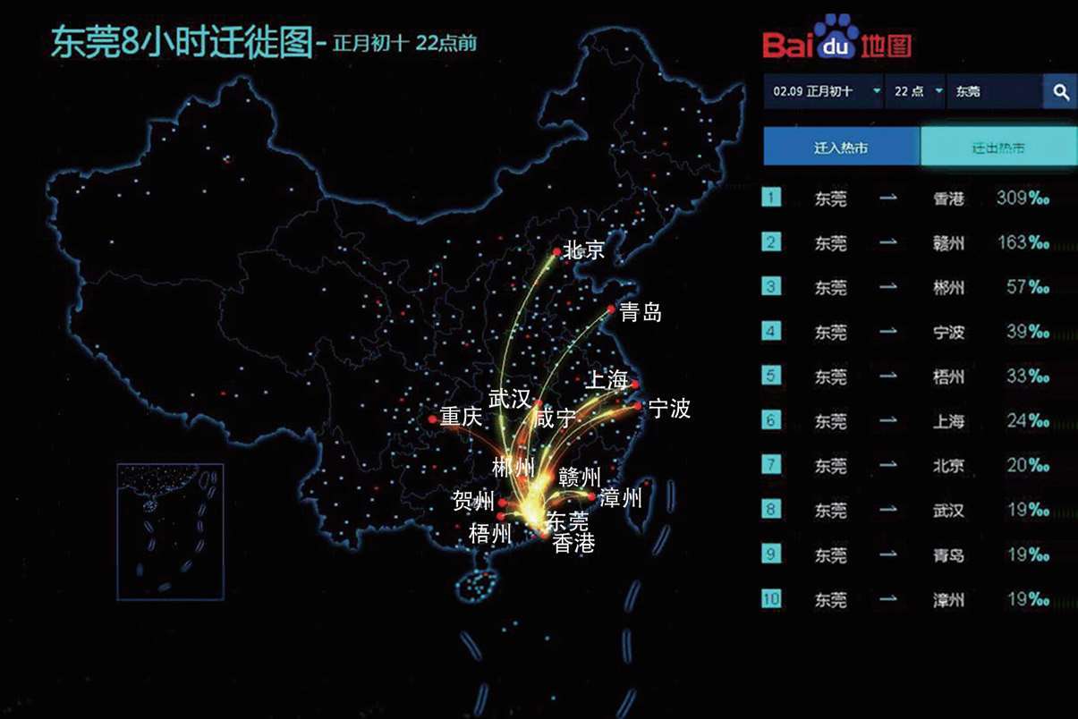 很多网民对图1-5印象深刻。这是2014年初在东莞“扫黄”之后,百度地图运用数据可视化技术,描绘出东莞与中国各地的迁徙线路热度。