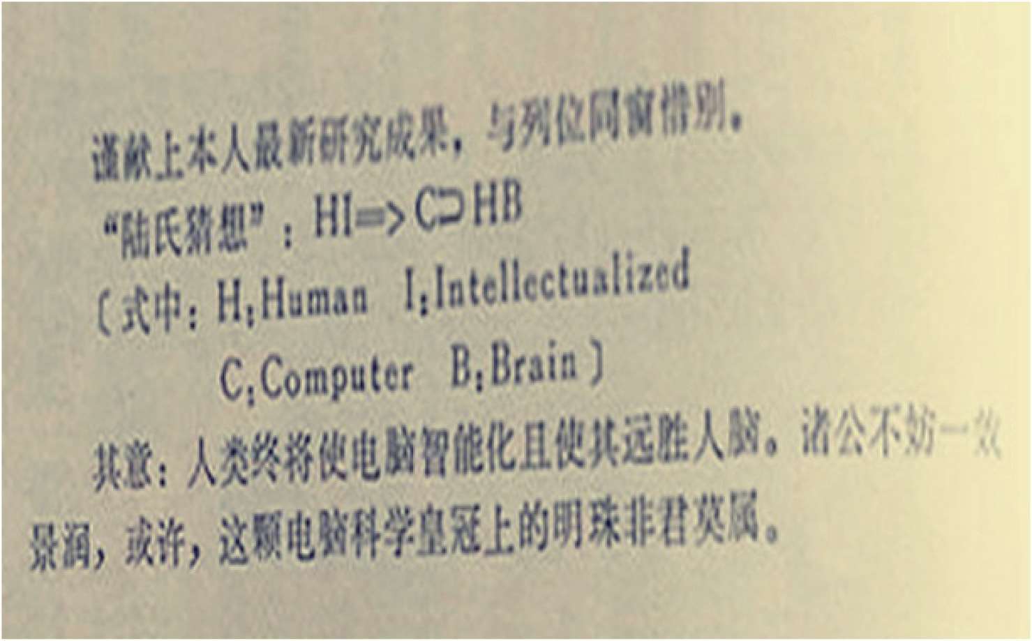 其意:人类终将使电脑智能化且使其远胜人脑。诸公不妨一效景润,或许,这颗电脑科学皇冠上的明珠非君莫属。