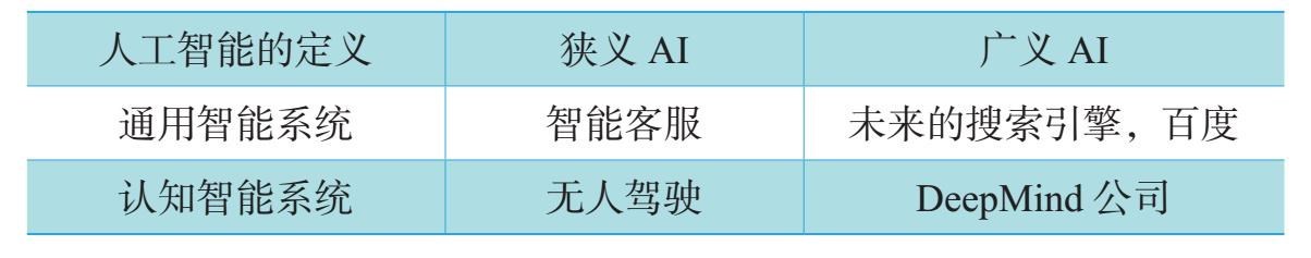 人工智能系统的另一个二分法是“狭义AI”(Narrow AI)和“广义AI”(Strong AI)。“广义AI”是使用相同的算法来解决一大类问题的系统。原则上,“广义AI”系统可以学习和适应以解决新的问题,而无须人为干预。“狭义AI”系统使用特定算法来解决特定问题,如下棋、识图等。