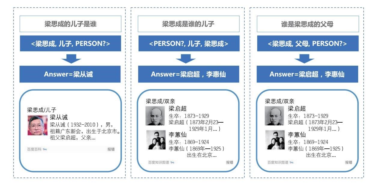 还有第三句话:谁是梁思成的父母。从字面上来看,这跟第二个句子不同,但是经过语义理解技术,机器发现这两个句子要找的是同一个对象。