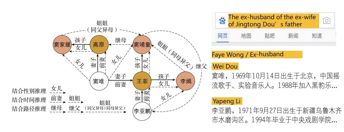 这句话里包含的人物关系是非常复杂的,然而,我们的推理系统可以轻松地分析出各实体之间的关系,并最终得出正确答案。