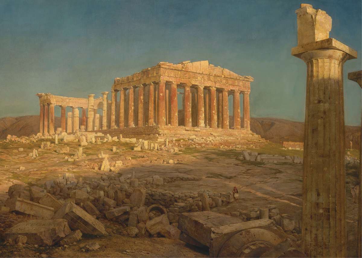 雅典娜等同于罗马神话中的密涅瓦。她也被称为帕拉斯·雅典娜,因为她曾误伤致死闺中密友帕拉斯,于是将后者的名字放在自己的名字前以示纪念。公元前5世纪(前447—前438),著名政治家伯里克利统治雅典期间,在雅典卫城修建了祭奉雅典娜的帕提侬神庙,“帕提侬”是处女之意。这座神庙后来多次被毁坏,一直在修复,从未被复原,总是被模仿,无法被超越。如今,在雅典的最高处,残破的多立克柱式和钢铁脚手架一起,成为当代世界最著名的照片背景。