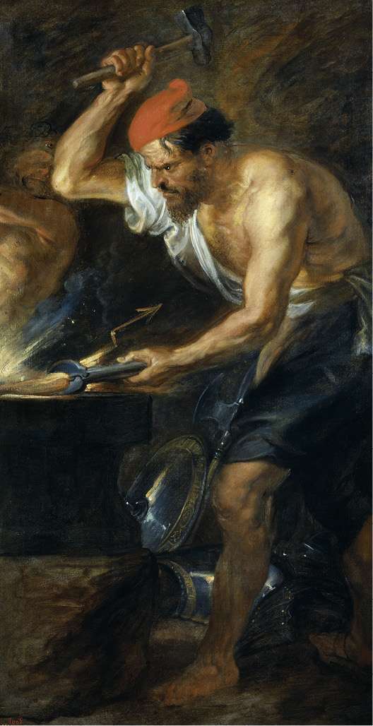 但是,火神貌丑心灵美,是奥林匹斯山第一能工巧匠,希腊神话里很多著名的物品都出自他的巧手,如赫拉的卧室装修、阿喀琉斯的盔甲盾牌、哈尔摩尼亚的项链等,甚至世界上第一个女人潘多拉也出自火神工作室。赫淮斯托斯的青铜宫殿堪称宇宙级实验室,里面劳动的多是机器人女仆,据说火山爆发就是他的作坊生火了。赫淮斯托斯不喜欢争斗,但愤怒的时候也不是好惹的角色,在特洛伊战争中他就大大地发挥了作为火神的特长。总的说来,可以相信赫淮斯托斯在劳动中找到了生活的价值与安慰,假如他继承了宙斯的好色品性,也可以消耗在体力劳动中。但命运女神却像好莱坞的编剧一样喜欢戏剧性,与其说她们是公平的,不如说喜欢恶作剧,因此火神的生活并不平安幸福。
