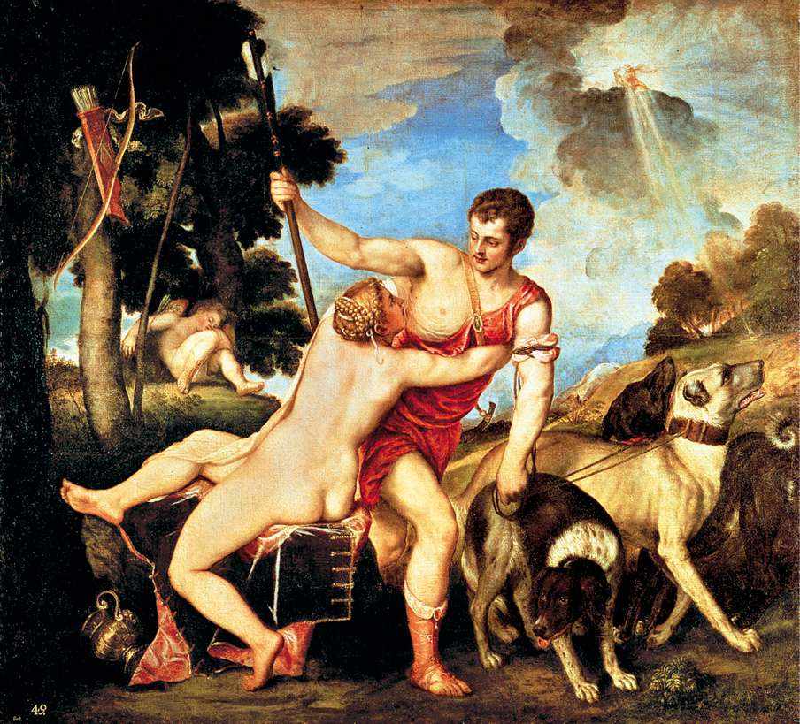 但为美貌与爱情而骄傲的阿都尼斯并不在意这些婆婆妈妈的嘱托,爱神走后,他冲进树林,奋勇地将长矛投向一头野猪。那头野猪巨大凶猛,以嘴自拔长矛,喷着热血冲向阿都尼斯。阿都尼斯魂飞魄散,没跑几步,野猪的獠牙已经刺入了他健美的身体。这头野猪,据说是战神阿瑞斯(或月神)出于嫉妒派来的杀手。也有的神话说,太阳神阿波罗的儿子厄律曼托斯因偷窥爱神洗浴而被弄瞎了眼睛,阿波罗就要在阿都尼斯身上报复。