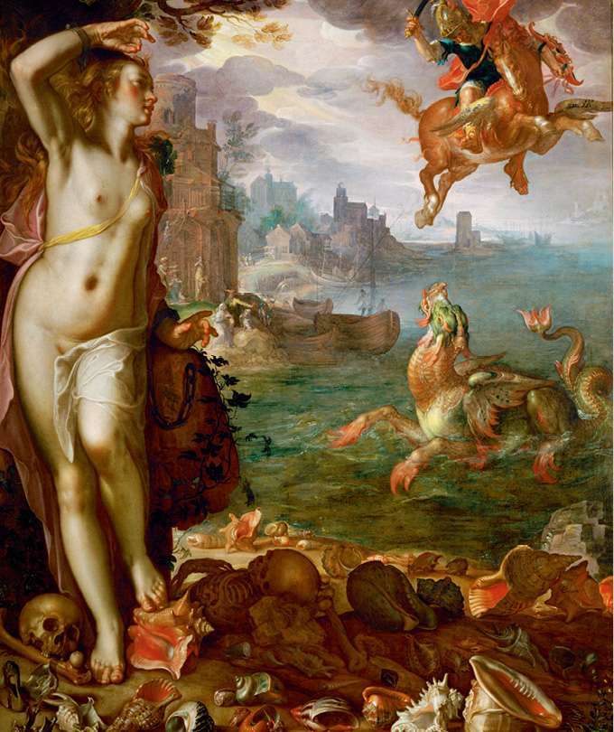 飞行骑士珀尔修斯爱上了美丽而不幸的姑娘。下面的故事是一个通行烂俗的套路:英雄救美女,美女嫁英雄。国王与王后感激地答应了他的要求,甚至愿意以整个王国陪嫁。此时,大海突然波涛震怒,巨大的海怪以巨船一样宽阔的胸脯分开海水,直向岸边扑来。在人们的惊呼声中,宙斯的儿子从天而降,用钻石刀刺向海怪。海怪暴跳冲出,巨口通红,吼声雷动,血水和海水使珀尔修斯鞋上的翅膀变得沉重起来。最后,他左手抓住岩石,向海怪的胸部刺出了致命的三刀。