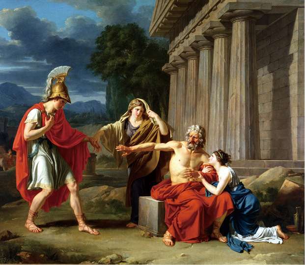 波吕尼刻斯果然不同于克瑞翁,他跪在父亲面前,抱着父亲的双腿,承认自己罪孽深重,希望父亲能宽恕。他还许诺,如果能夺回王权,仍然交给父亲执掌。尽管波吕尼刻斯情真意切,但俄狄浦斯毫不为之所动。他已经心如死灰,唯一的心愿就是净尽罪孽,安宁地死去。他送给波吕尼刻斯的,仍然是恶毒的诅咒:你们兄弟两个将倒在一片血泊中。