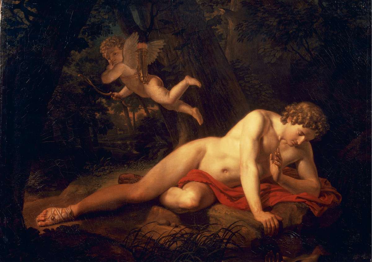 有一天,那耳喀索斯进山林中打猎,与伙伴们走散。碰巧被仙女厄科看见,厄科立即爱上了他:天下竟然有这么美丽的少年啊!有趣的是,两个人的精神世界呈现对称性:那耳喀索斯唯我主义,只爱自己,厄科没有自信,只能爱别人。两个人的爱都是半块,似乎可以互相弥补。若在从前,以厄科喋喋不休的性格也许恰好可以对付不爱理睬人的少年。但现在他们缺乏交流的可能和能力,少男拒绝接受,少女无法给予。爱情是从爱自己出发的,并像雷达一样要求回波,他们都缺少其中的一项,所以是天地间最遥远的一对。