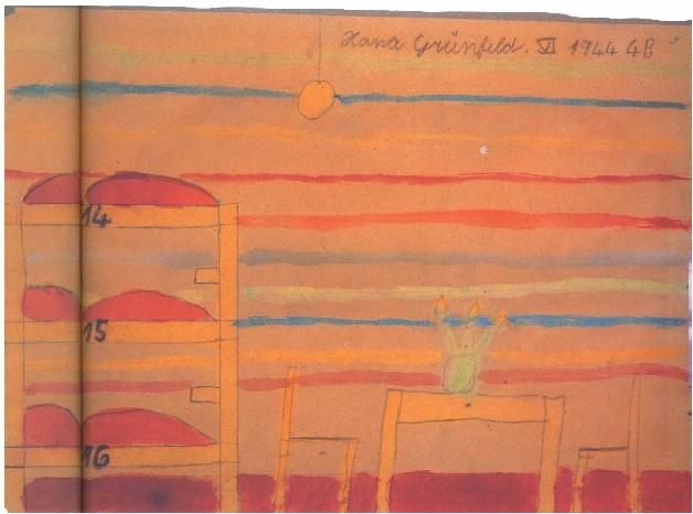 哈娜是个很小的女孩,她出生在一九三五年五月二十日。一九四一年十二月十四日,被遣送到特莱津时她才六岁半。当时她住在特莱津第六街区。一九四四年,她被杀死在奥斯威辛集中营,只有九岁。这张画就是在她死去的那一年画的。画的右上角注明了姓名日期等,字迹老练,我猜想可能是因为她太小,由老师来替她写的。