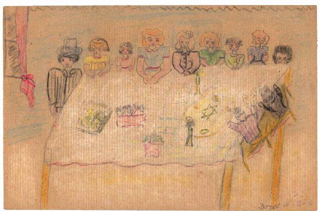 多丽丝和她在特莱津的小伙伴们,再也不能按照传统,在家里过逾越节。亲人四散,他们甚至不知道自己的父母和兄弟姐妹在哪里。可是,多丽丝和其他一些孩子,用笔在纸上画下了他们的逾越节聚会,那不仅是对家的怀念,也是用另一种形式,表达他们的民族认同和宗教信仰。
