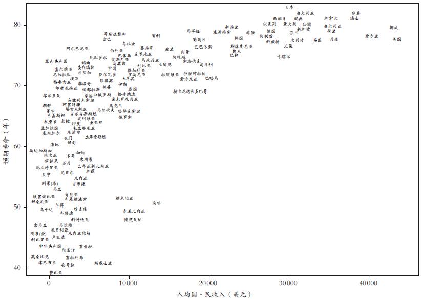 图表1.1:经济发展只在早期阶段有助于提高预期寿命