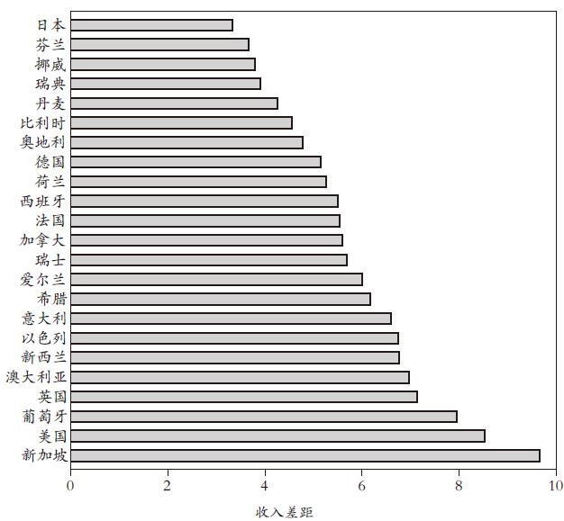 图表2.1所展现的是各发达国家的收入差距情况。位于最上方的是最平等的国家,位于最下方的是最不平等的国家。水平条的长度衡量的是各国最富有的20%人群与最贫穷的20%人群财富对比的情况。在图表上方的日本和斯堪的纳维亚国家,最富有的20%人群财富为最贫穷的20%人群的不到四倍。对于图表下方的国家而言,收入差距至少翻了一番,其中有两个国家最富有的20%人群财富为最贫穷的20%人群的九倍多。最不平等的国家包括新加坡、美国、葡萄牙和英国(图表使用的数据是扣除了税收和福利之后的家庭收入,并根据每个家庭的人口数量进行了调整)。